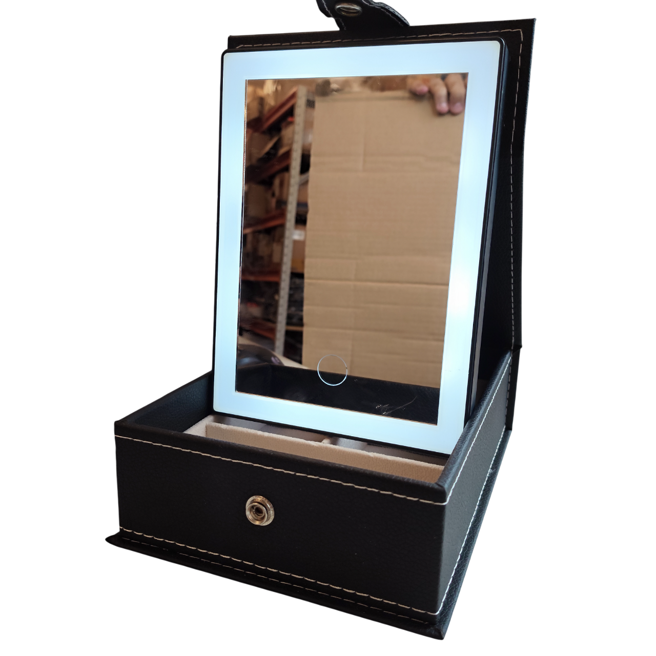 Iluminação Integrada: Sistema de LED que contorna o espelho interno, ideal para retoques e visualização detalhada das peças.